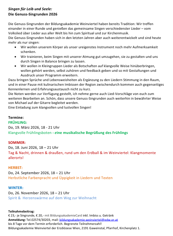 Donnerstag, 19. März 2026, 18 - 21 Uhr Klangvolle Frühlingsboten - eine musikalische Begrüßung des Frühlings Gaweinstal, Bildungsakademie |